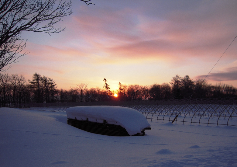 雪に埋まった畑地の向こうから初日が昇ってきました。