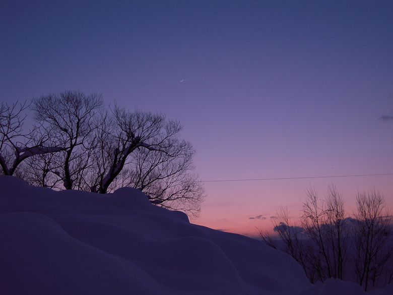 木の上には細い月(月齢1.8)が見えました。雪かきで疲れた体をリフレッシュさせる眺めでした。