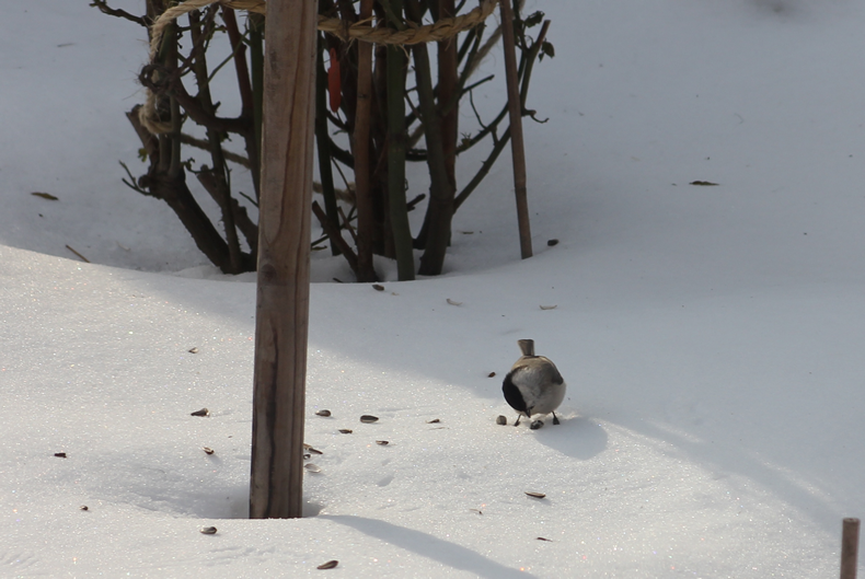 雪上に落ちたヒマワリの種をくわえようとする姿が何とも可愛らしいです。