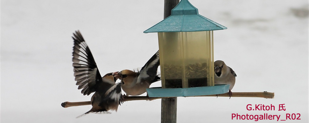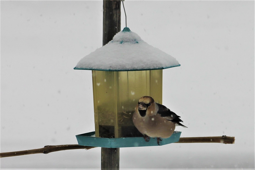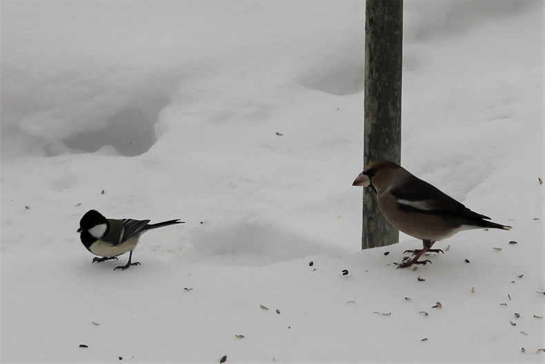 雪が降りはじめた正午過ぎ、シメが飛んで来ました。今日来たシメは仲が悪く噛み合いを