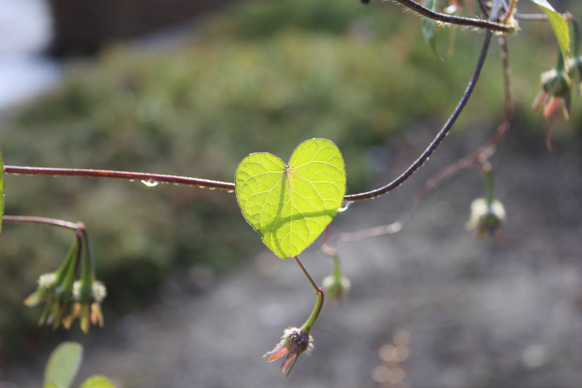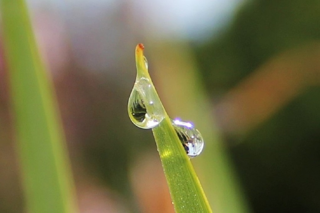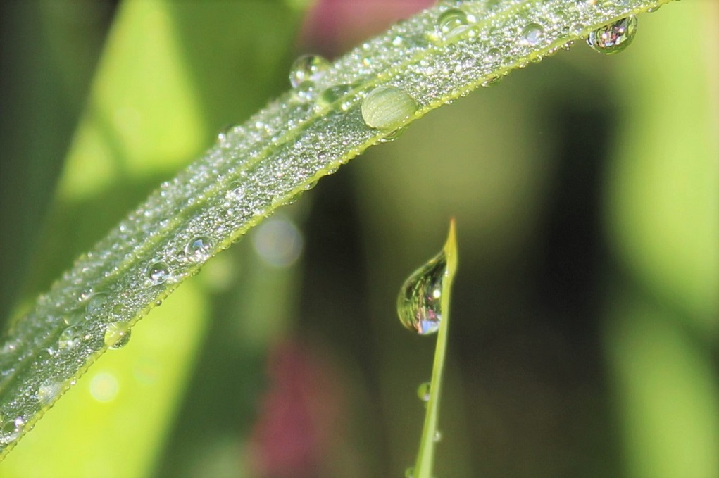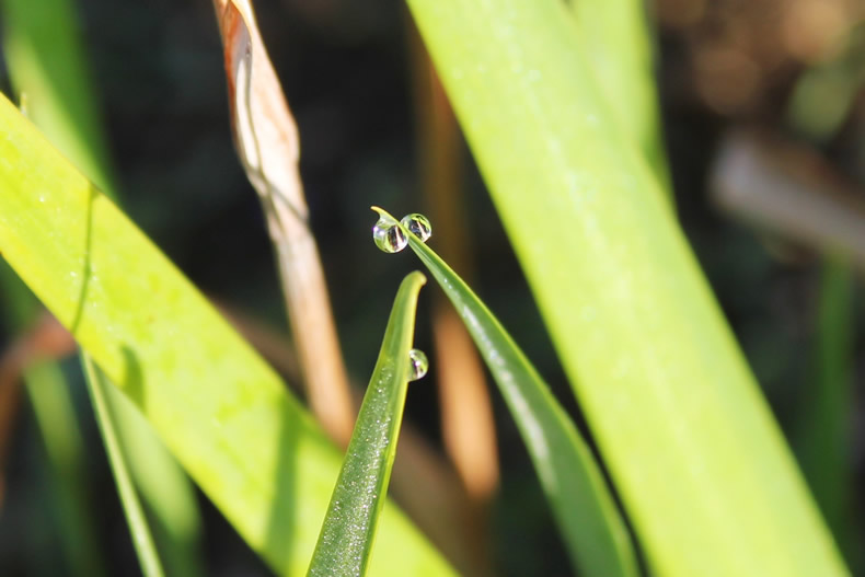 刈り取らないでいた花菖蒲の葉に露が付いていました。落ちることなく付いています。