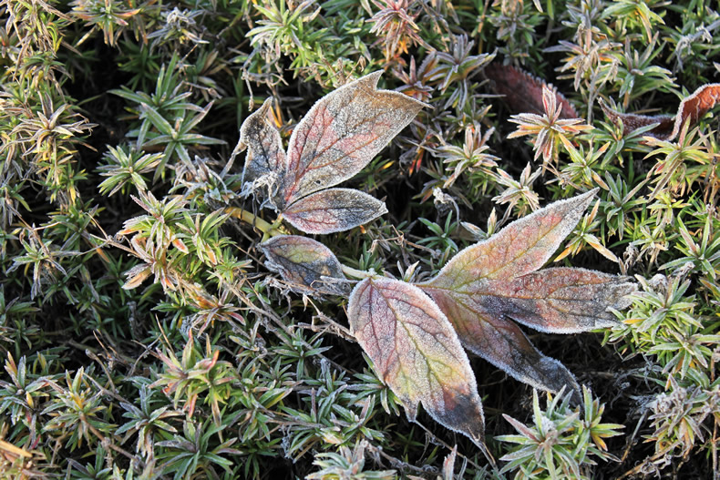 露は凍っていました。下の落ち葉などには霜が模様を作っていました。