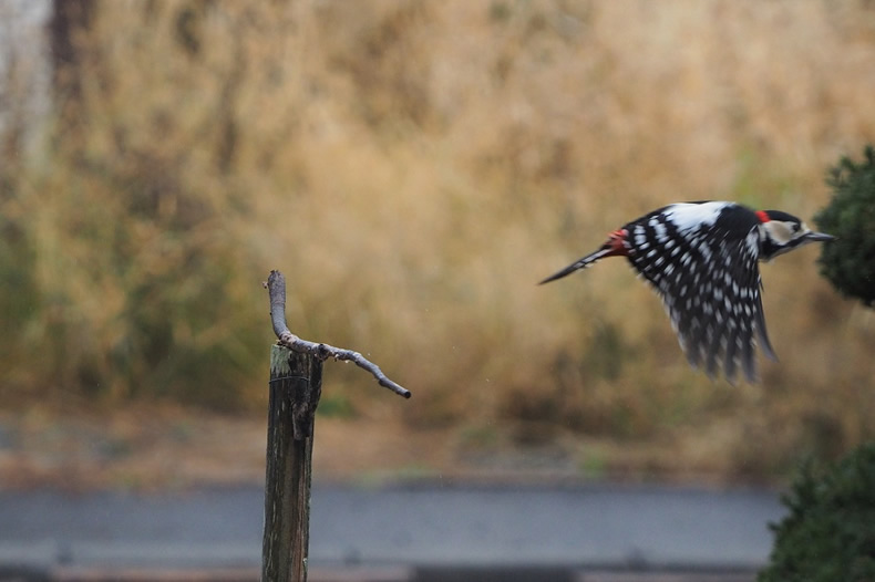 庭にシジュウカラが時々来ています。この日は、トンボが傍を飛んで行きました。