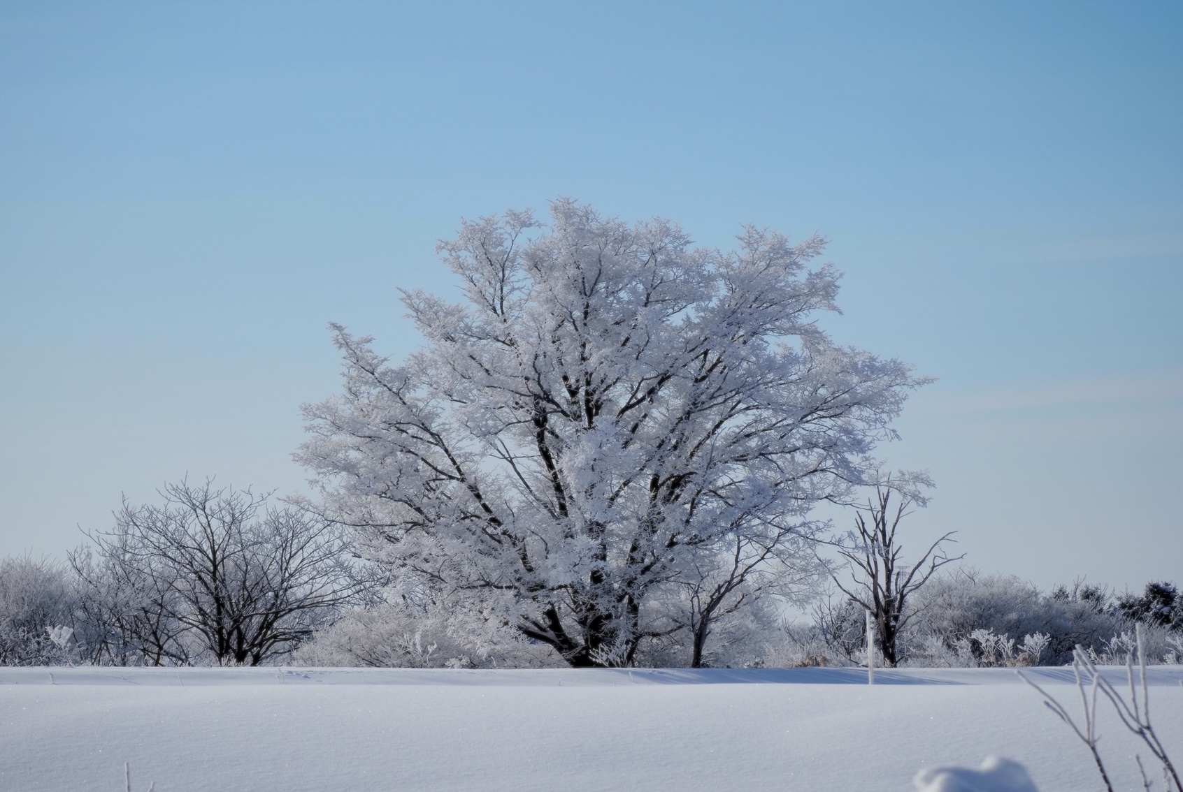 川向こうの木は霧氷に覆われていました。