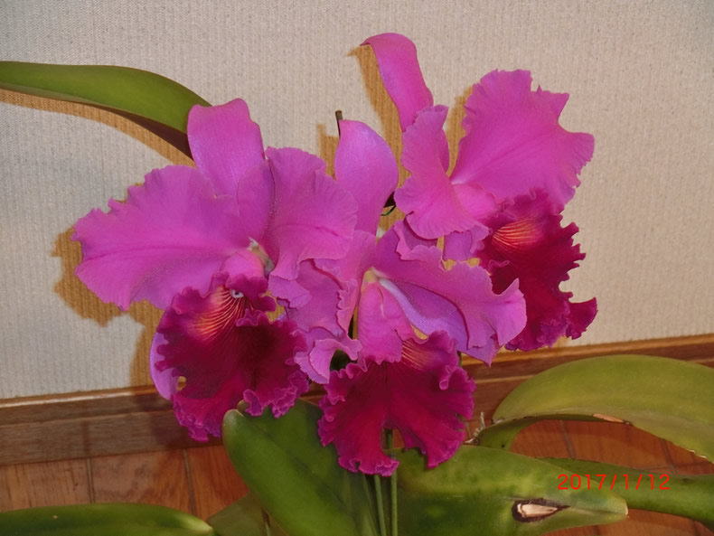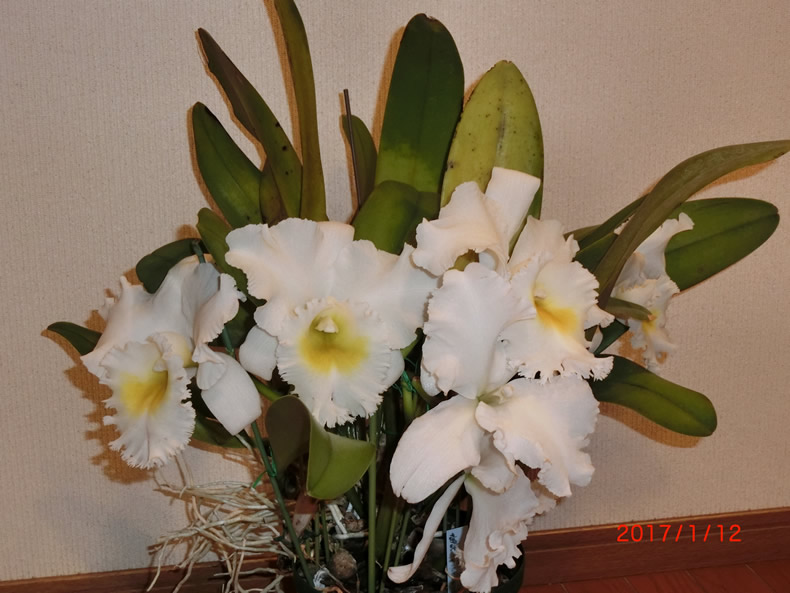 我が家のカトレア、今2株咲いています。 白花は写っていませんが、10 輪咲いています。来月は世界ラン展(東京後楽園球場)に行く予定です。 h29(2017).01.18 M.Senna 下写真を左クリックしますと大きな写真(横1500ピクセル)でご覧いただけます。